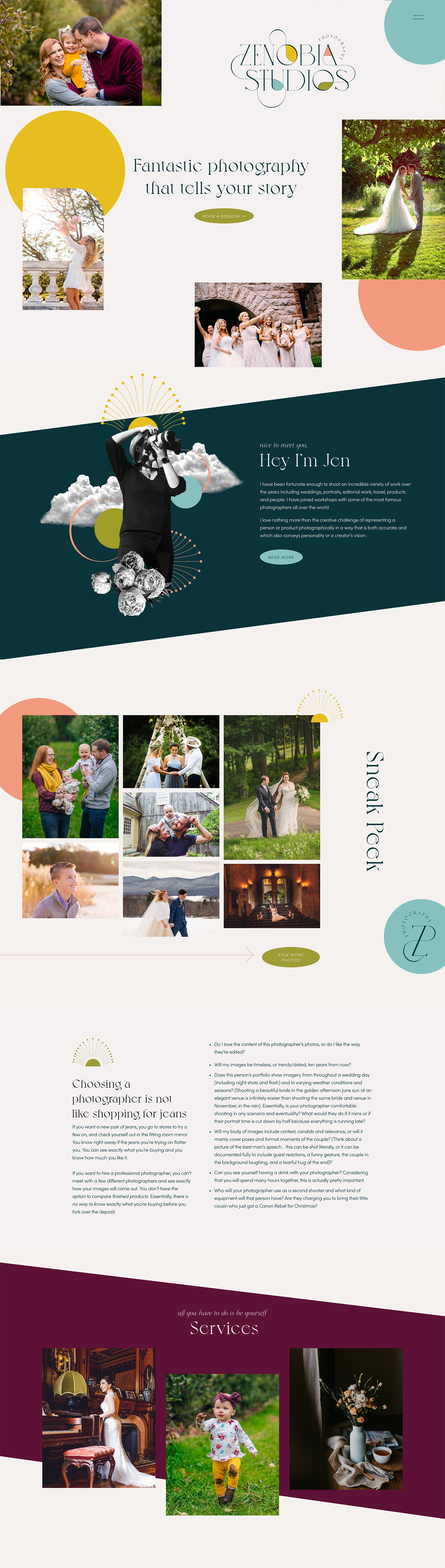 Zenobia Studios is a photography studio that specializes in wedding, portrait, and commercial photography. Jen, the founder of Zenobia Studios, initially came to me wanting to make some improvements to their website. However, I immediately noticed that their branding and website were not communicating their bright and bubbly personality and not reaching their ideal audience.